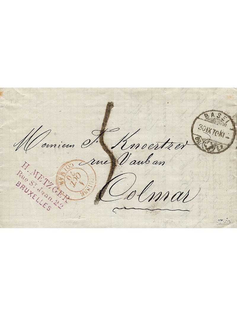 Bruxelles du 28 sept70, très belle correspondance concernant le siège de Strasbourg, transportée par passeur déposée à Bâle le 30 septe 1870 et taxée car non affranchie puis expédiée par la poste à destination de Colmar. Au recto, le cad rouge, Suisse Colmar le 1 octobre 70 et le cachet de l'expéditeur. Au verso, le cad d'arrivée à Colmar le 1 octobre 70, dernier jour de la poste française à Colmar. Exceptionnelle combinaison. Lettre superbe. Signée avec certificat.