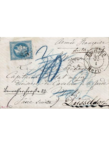 Empire Lauré 20 centimes bleu, oblitéré gros chiffres85, sur enveloppe d'Amiens le 7 novembre 1870 pour le capitaine d'Etat Major à METZ. Arrivée alors que le capitaine était prisonnier, elle fut réexpédiée à Düsseldorf. Au recto, le très rare cachet de retour Entlastet/Berlin et les taxes allemandes. Au verso, le cachet d'arrivée. Superbe, signée. Certificat.