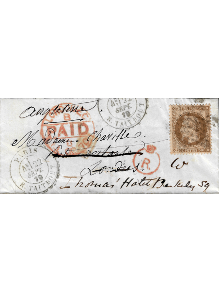 Empire Lauré 30 centimes brun, oblitéré étoile sur lettre à destination Le Londres réexpédiée. Au recto, le cad de Paris le 22 septembre, le cachet rouge d'arrivée à Londres et la rare marque de réexpédition de Londres. Très beau avec certificat.