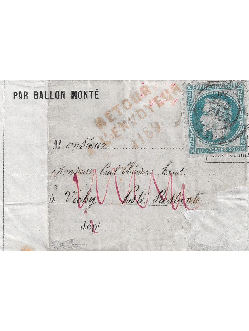 Empire Lauré 20 centimes bleu sur lettre avec correspondance à destination de Vichy poste restante. La lettre a été remise directement aux Aérostiers qui ont apposé leur cachet rouge au verso. Le timbre a été oblitéré par le cachet de Tours le 23 octobre 70. La lettre est arrivée le même jour à Vichy, voir le cachet d'arrivée au verso et n'a manifestement pas été distribuée. Le cachet Retour à l'envoyeur a été apposé au recto. Exceptionnel probablement unique. Signé avec certificat.
