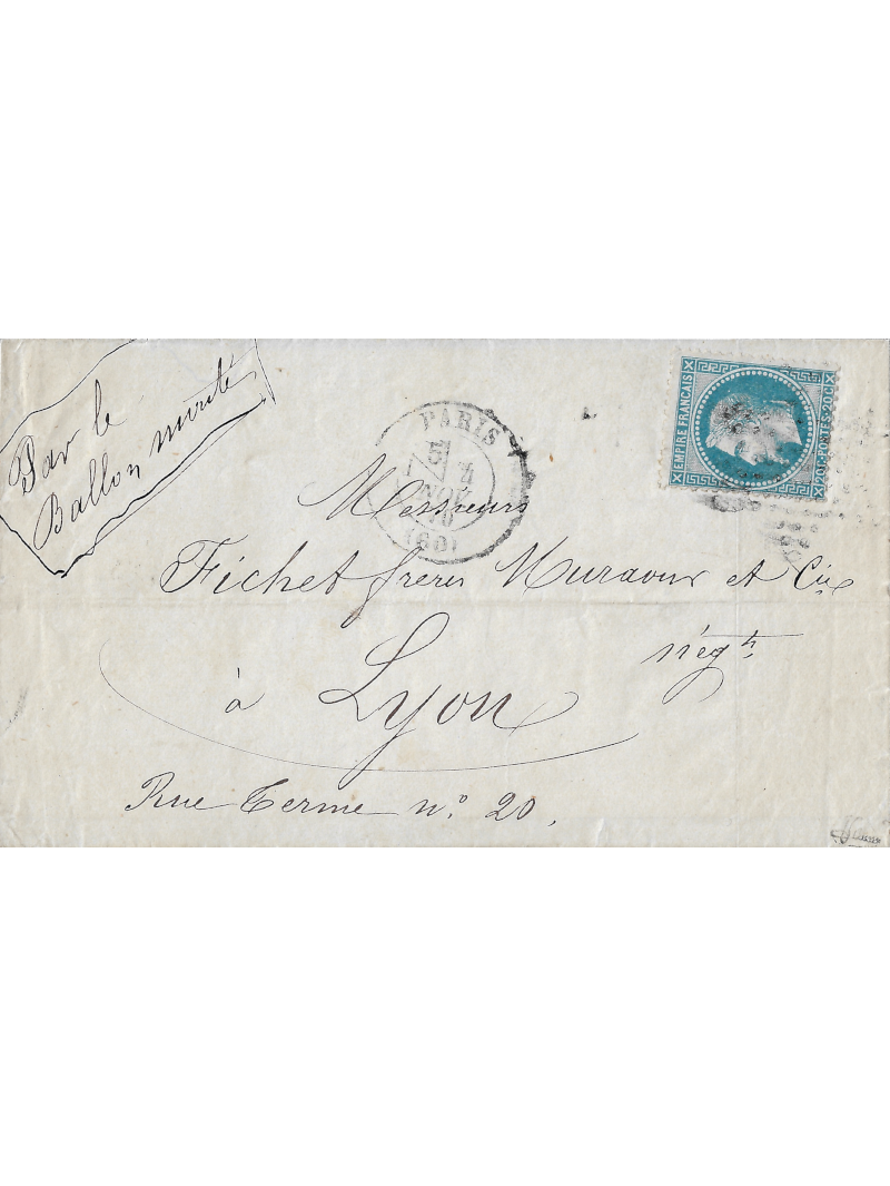 Empire Lauré 20 centimes bleu, oblitéré par l'étoile pleine, sur une lettre à destination de Lyon. Au recto, le cachet à date de type 17 avec section de levée intermédiaire, le 4 novembre 70, n°1 de la 5ème levée. Signé Brun.