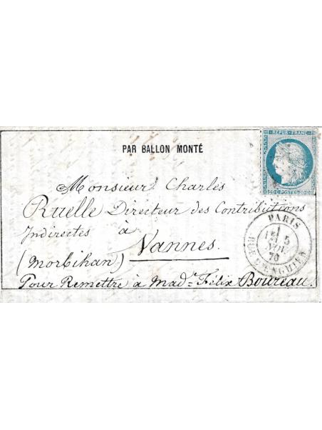 Siège de Paris 20 centimes bleu défaut dans un angle, oblitéré par l'étoile 4, sur Ballon Poste n°1 (texte militaire très instructif) à destination de Vannes dans le Morbihan. Au recto, le cachet à date de Paris le 5 novembre 170. Au verso, le cachet d'arrivée le 10 novembre 1870. Exceptionnel, rarissime journal. Signé Roumet avec certificat.