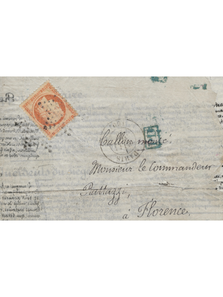 Siège de Paris 40 centimes orange, oblitéré par l'étoile, sur une Agence Havas édition Française à destination de Florence en Italie. Au recto, le cad de Paris le 11 novem 70 et PD en bleu. Cote Yvert et Tellier sans arrivée : 5000 €. Superbe, rare composition avec cette destination. Signé.