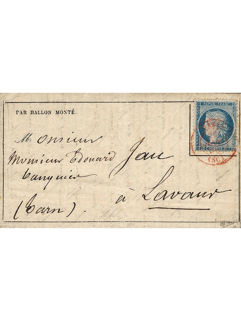20 centimes siège bleu oblitéré par le cachet à date Paris SC rouge du 23 novembre 1870 sur la Gazette des absents n°10 à destination de Lavaur dans le Tarn. Au verso, le cachet d'arrivée à Lavaur le 14 décembre 1870. La ville d'Orléans certain. Les ballons oblitérés SC rouge de la Ville d'ORLEANS proviennent tous du courrier retrouvé à la ferme du Tunet en Norvège. Cote Yvert et Tellier de l'ensemble : 3650 €. Superbe signé Calves et Behr. Certificats.