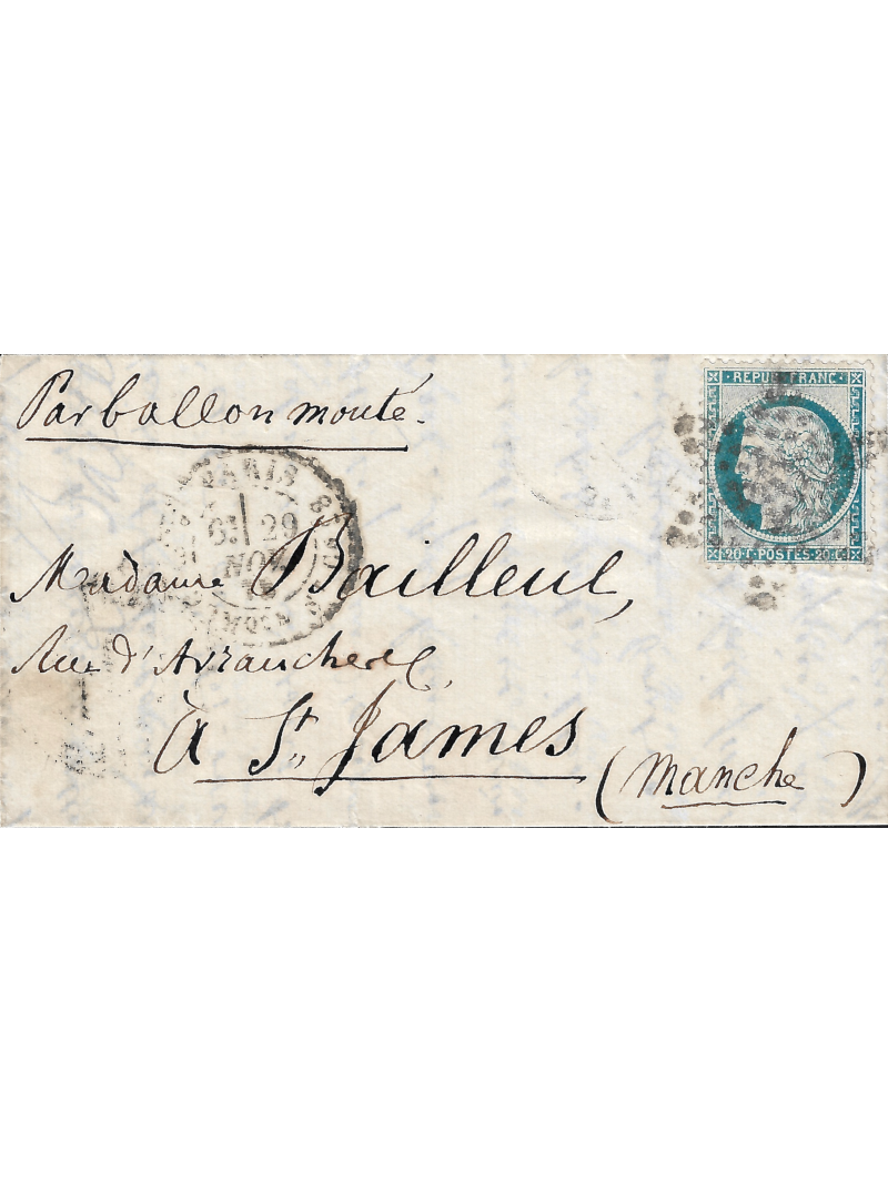 20 centimes bleu du siège oblitéré par l'étoile sur lettre avec correspondance pour St James. Au recto, le cad de Paris 29 nov 1870. Au verso, le rare cachet du bureau de passe du 2 dec et le cachet d'arrivée.