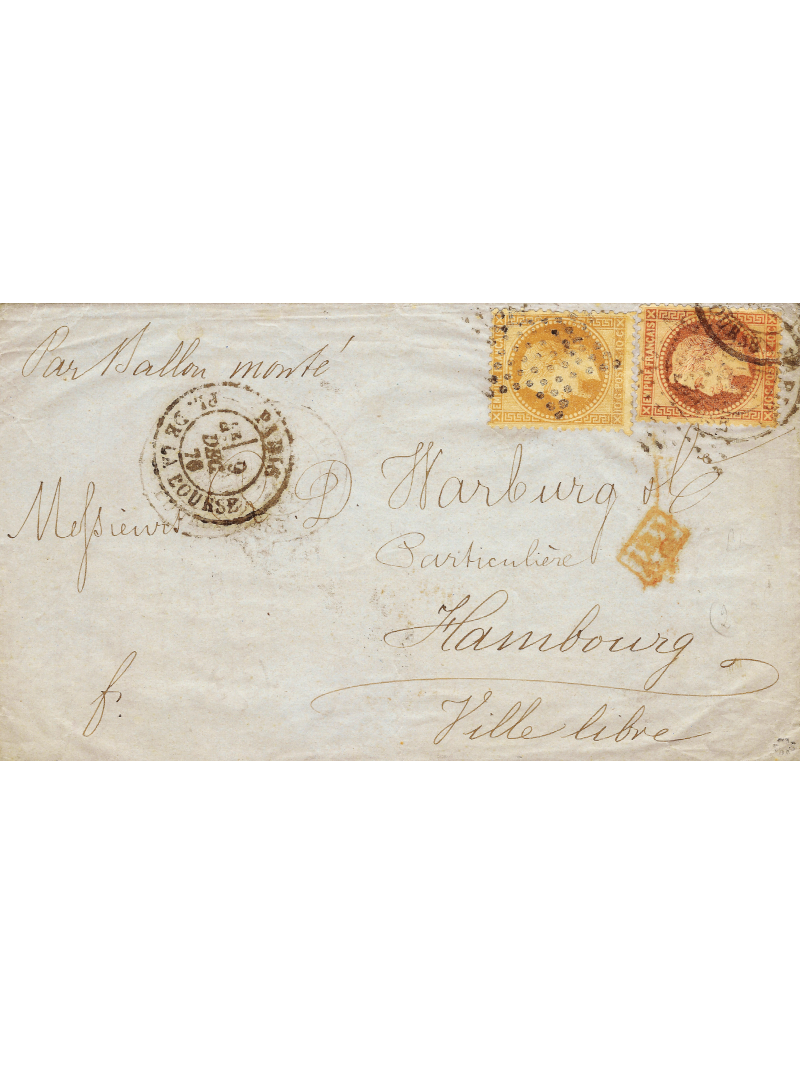 Empire Lauré 10 c de bistre et 40 c orange, oblitéré par l'étoile, lettre avec un rare format pour les Ballons montés, à destination de Hambourg. Au recto, le cachet Paris Place de la Bourse, 9 décembre 70. Très rare destination (tarif à 50 centimes) et bel affranchissement. Cote Spink Maury : 5500 €. Signé Roumet avec certificat.