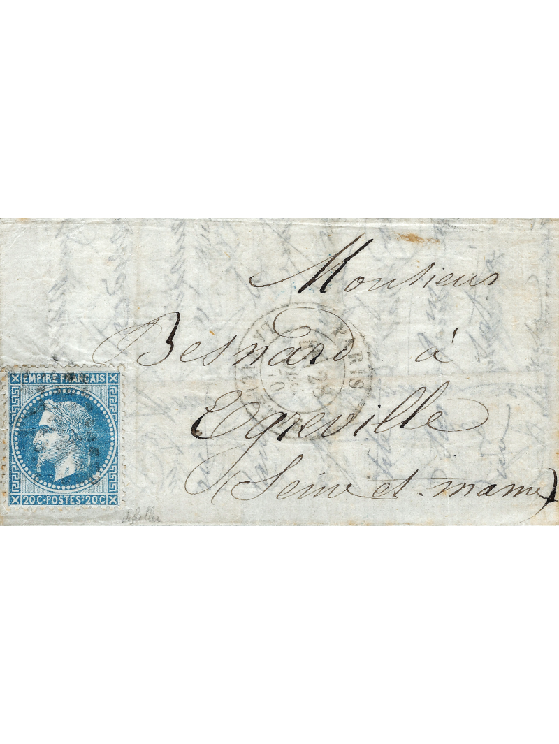 Empire Lauré 20 centimes bleu, oblitéré losange gros chiffres 4277, bureau de la Villette sur lettre avec correspondance pour Egreville, arrivée le 17 janvier 71. Destination située en zone occupée. Cote avec cad d'arrivée : 1950 €. TB. Signé SCHELLER.