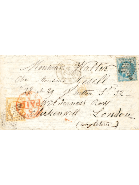 Empire Lauré 20 centimes bleu, et émission du siège 10 centimes bistre, oblitérés par l'étoile 1 , sur lettre, avec correspondance, rare grand format à destination de Londres. Au recto, le cad de Paris place de la Bourse le 27 déc 70 et le cachet rouge paid d'arrivée à Londres le 8 janvier frappée sur le timbre. Très belle composition. Signé.