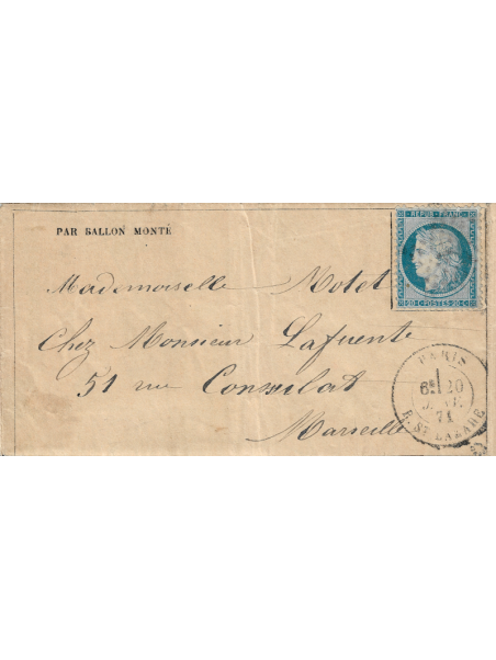 Siège de Paris 20 centimes bleu, oblitéré étoile, sur la gazette des absents n°29 à destination de Marseille. Au recto, le cachet à date de Paris le 20 janvier 71 et au verso, le cachet d'arrivée à Marseille le 29 janvier. A l'intérieur, le petit plan de Paris en couleur ayant voyagé avec la gazette. En rouge, les différents forts qui défendent Paris de l'invasion allemande. Exceptionnel, signé Roumet avec certificat.