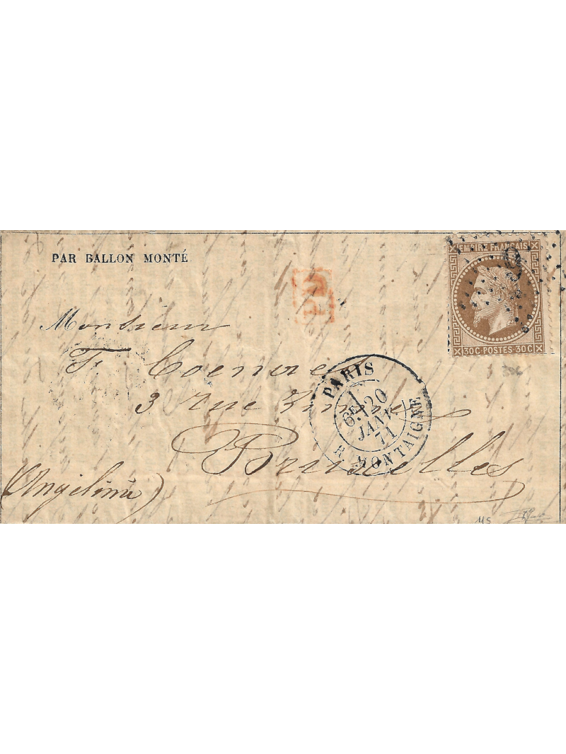 Siège de Paris 30 centimes brun, oblitéré étoile, sur la gazette des absents n°29 à destination de Bruxelles. Au recto, le cachet à date de Paris le 20 janvier 71 et au verso, le cachet d'arrivée le 22 janvier. A l'intérieur des images des scènes parisiennes en couleur ayant voyagées avec la gazette. Les deux représentent des chutes d'obus. Exceptionnel, signé Goebel avec certificat.