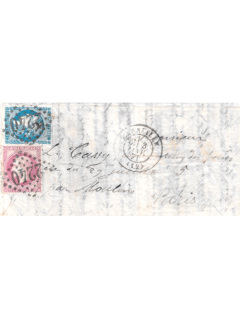 Empire Lauré 80 centimes rose avec très léger défaut, (normal pour les boules de moulins) et Emission de Bordeaux, 20 centimes bleu type II, oblitérés par le losange gros chiffres 2240. Au recto, le cachet à date de Marseille le 3 janvier 1871. Superbe composition avec bel affranchissement.