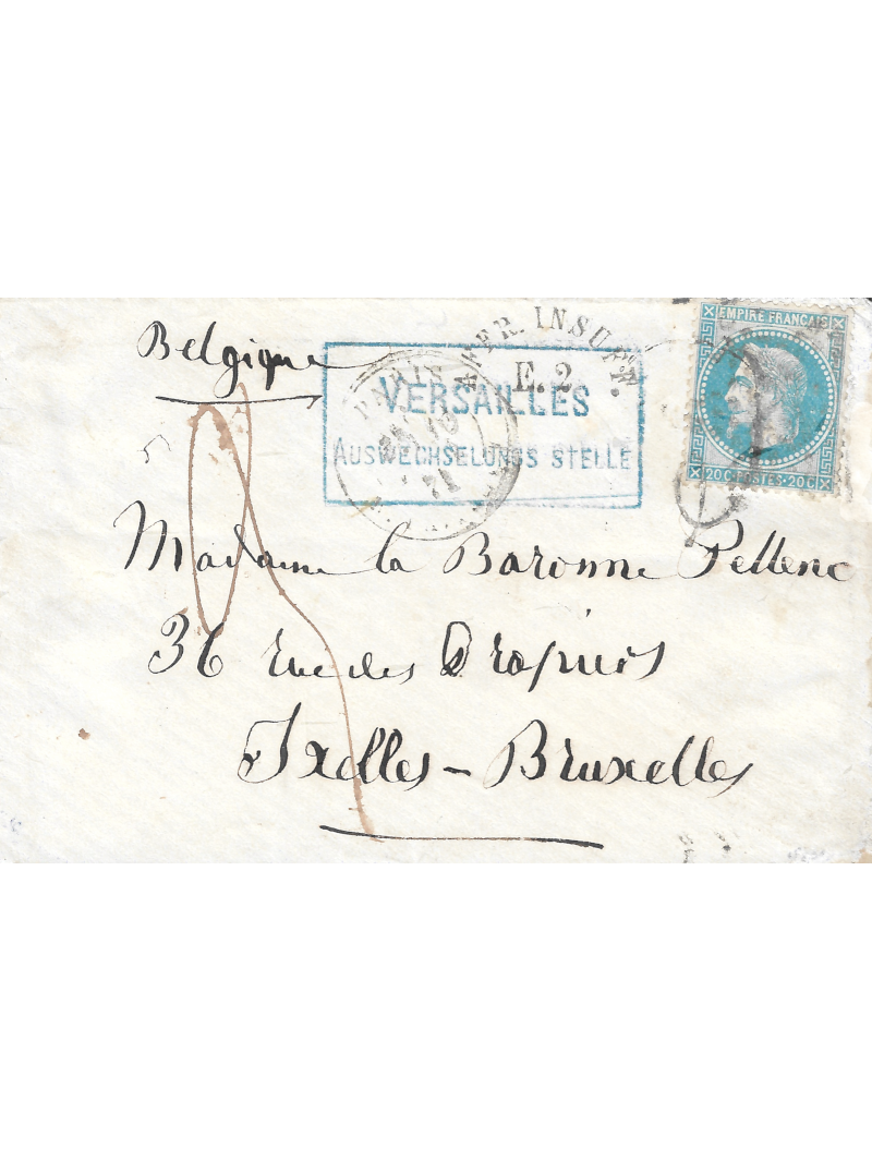 Empire lauré 20 centimes bleu oblitéré étoile (très légère) et taxe, sur lettre taxée à destination de Bruxelles (tarif à 30 centimes). Au recto, à date de Paris le 10 février 71 et au recto, également, la marque rectangulaire bleue de la censure allemande de Versailles (premier jour d'utilisation) ainsi que la marque AFFR. INSUF. E. 2. Lettre superbe et très rare composition.
