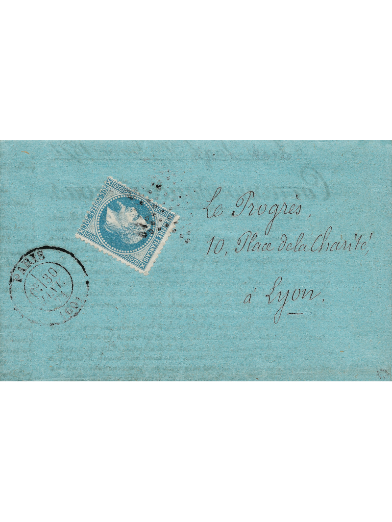 Empire Lauré 20 centimes bleu oblitéré étoile une correspondance Havas à destination du Progrès de Lyon. Au recto, le cachet de Paris le 30 janvier 1871, deux jours après la fin du siège. Au verso, le cachet d'arrivée le 12 février 71 (passée par la censure à Versailles). Signée Roumet avec certificat.