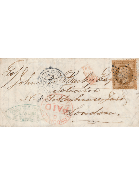 Empire lauré 30 centimes brun, oblitéré par l'étoile 35 sur lettre à destination de Londres. Au recto, le cad de Paris Ministère des Finances le 3 février 71, le cachet d'arrivée et PP en rouge. Lettre ouverte, devant transiter par Versailles.