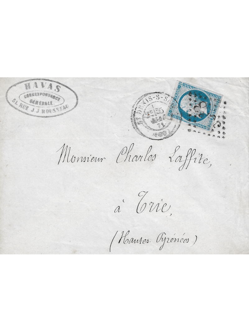 Empire non dentelé 20 centimes bleu type I (n°14A de 1854) au filet en haut à droite, oblitéré par le losange gros chiffre 3568 sur une enveloppe de l'agence Havas à destination de Trie, déposée au bureau de Saint Denis sur Seine. Au recto, le cachet à date du 5 mai 1871. Exceptionnelle affranchissement pour cette période. Signée Roumet. Certificat.