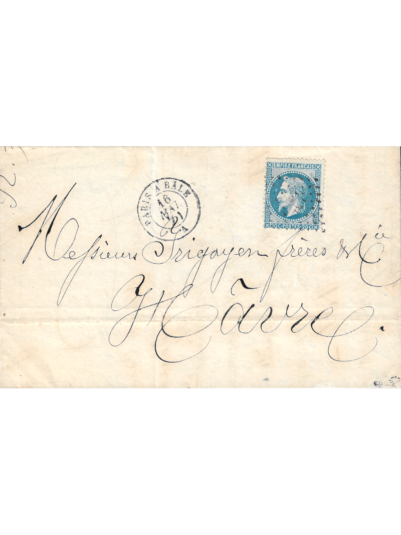 Empire lauré 20 centimes bleu, oblitéré par le losange BP, sur une lettre avec correspondance, datée du 14 mai 1871, à destination du Havre. La lettre est partie de Paris pendant le blocus, par passeur privé qui l'a remise directement à l'ambulant. Au recto, le cachet à date des ambulants de Paris à Bâle le 16 mai 1871. Exceptionnelle combinaison. Signée Brun et Roumet. Certificat.