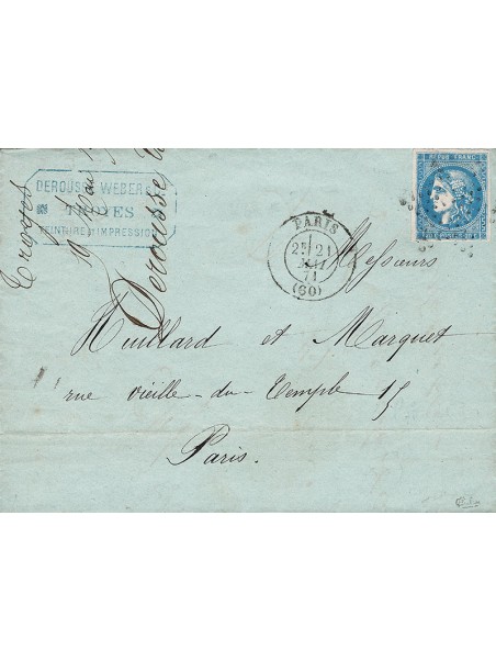 Emission de Bordeaux, 20 centimes bleu n°46b, sur lettre avec correspondance, envoyée de Troyes à destination de Paris. La lettre a été transportée par porteur qui l'a déposé à la poste ou dans une boîte le premier jour de la semaine sanglante. Elle a ensuite repris sont cheminement normal. Le timbre a été oblitéré par l'étoile de Paris. Au recto, le cachet à date de Paris le 21 mai 1871, 2ème levée (dimanche). Superbe et rarissime. Signée Calves.
