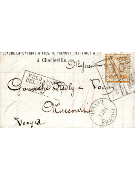 10 centimes bistre oblitéré par le cachet militaire rectangulaire de la poste royale prussienne de campagne (FELD - POST RELAIS n°90) sur une lettre avec correspondance à destination de Mirecourt. Au recto, la taxe 20 rouge de la poste cantonale de Mirecourt et le petit cachet provisoire d'Epinal. Superbe et très rare composition. Signée Heckler. Certificat.