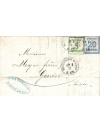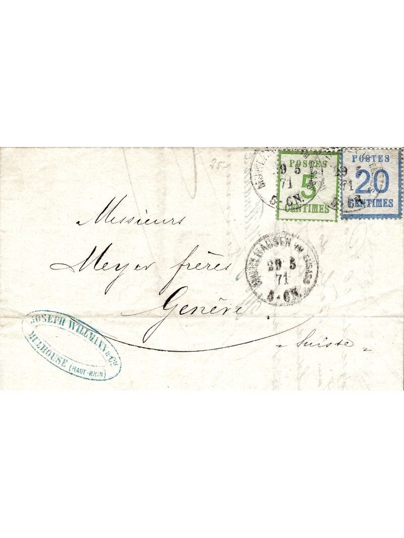 20 centimes bleu et 5 centimes vert oblitérés par le cachet Allemande de Mulhausen (Mulhouse) simple cercle du 29/05/1871 avec correspondance à destination de Genève en Suisse. Au verso, le cachet à date d'arrivée. Superbe et signée HECKLER.