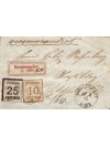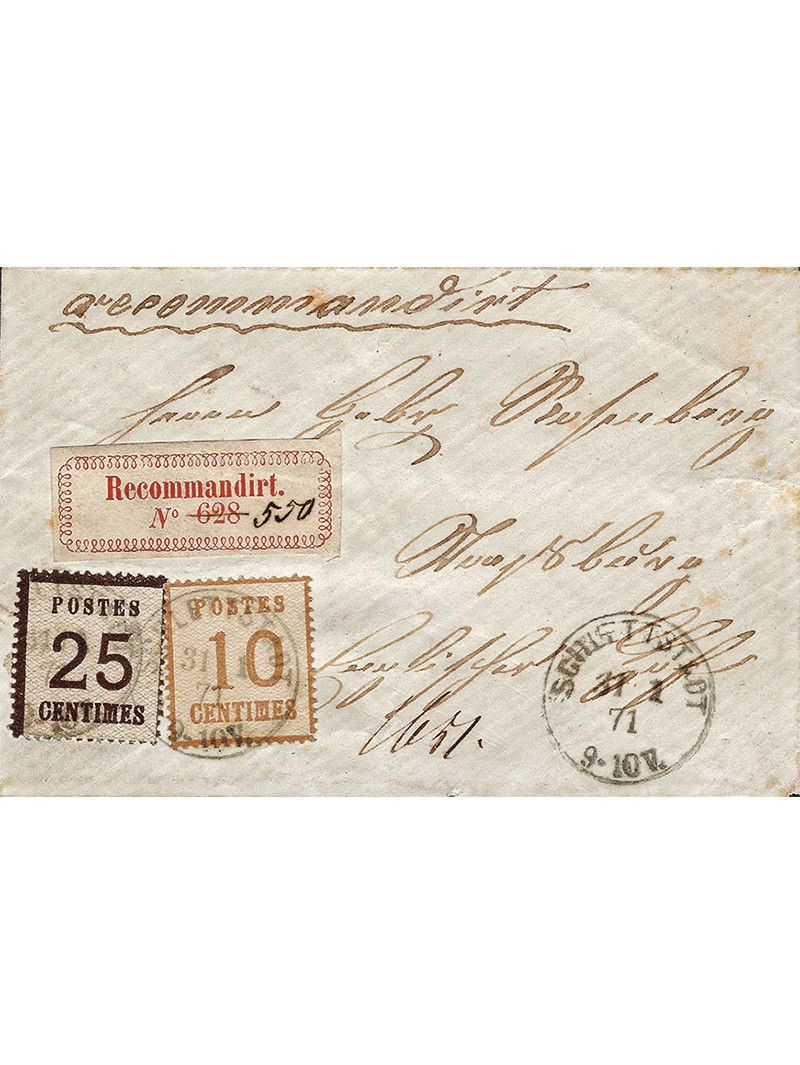 25 centimes brun et 10 centimes bistre oblitérés cachet simple cercle allemand de Shlettstadt le 31-01-1871, 3 jours après l'armistice. Au recto, l'étiquette "Recommandirt" (4mois après la 1ère utilisation) lettre recommandée et répété le cachet à date, sur enveloppe à destination de Strasbourg. Au verso, le cachet à date d'arrivée. Superbe. Signée.