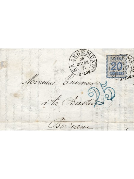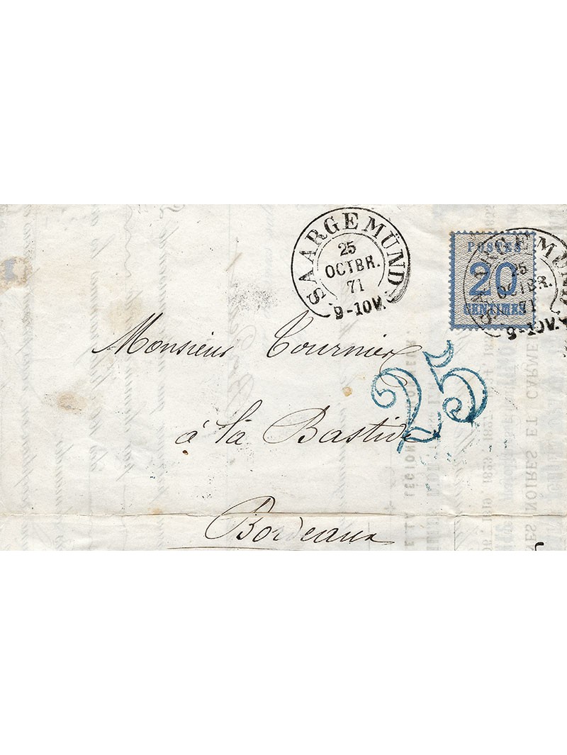 20 centimes bleu pour l'affranchissement en zone cédée aux allemands, oblitérés par le cachet de type fer à cheval de Saargemund le 25 octobre 71 et au recto, la taxe à 25 centimes double trait bleu, pour la zone non occupée. Très belles frappes des cachets et de la taxe. Superbe et signée HECKLER. Certificat.