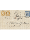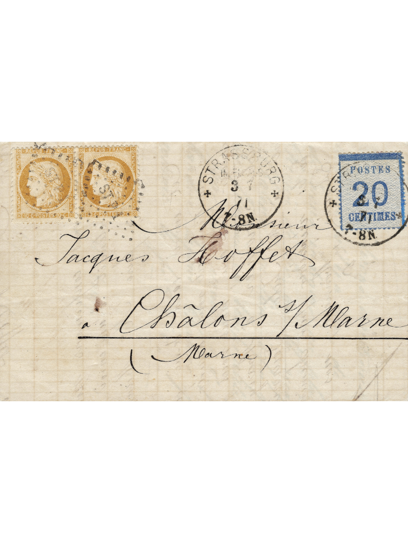 20 centimes bleu, de l'émission dite d'Alsace Lorraine, oblitéré par le cachet allemand simple cercle de Strassburg (Strasbourg) le 3 juillet 71 et émission du siège 10 centimes bistre en paire oblitérés par le losange STP1 des ambulants de Strasbourg à Paris sur lettre à destination de Chalons sur Marne.