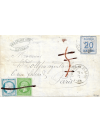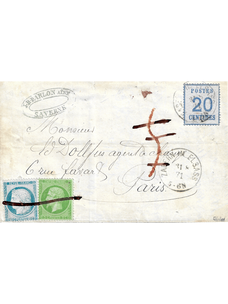 20 centimes bleu, de l'émission dite d'Alsace Lorraine, oblitéré par le cachet allemand simple cercle de Zabern IM Elsass, (Saverne) et émission du siège 20 centimes bleu + empire dentelé 5 centimes vert oblitérés à la plume. Lettre à destination de Paris, avec au recto la taxe annulée. Superbe, très rare annulation. Signée Calves, Roumet. Certificat.