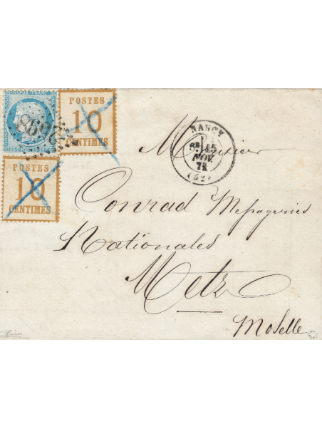 10 centimes bistre oblitérés par une croix de plume et 20 centimes bleu, émission du siège, oblitéré Losange gros chiffres 2598 sur une lettre avec correspondance de Nancy à destination de Metz. Au recto, le cachet à date type 17 de Nancy le 15 novembre 71. Signée Roumet. Certificat.