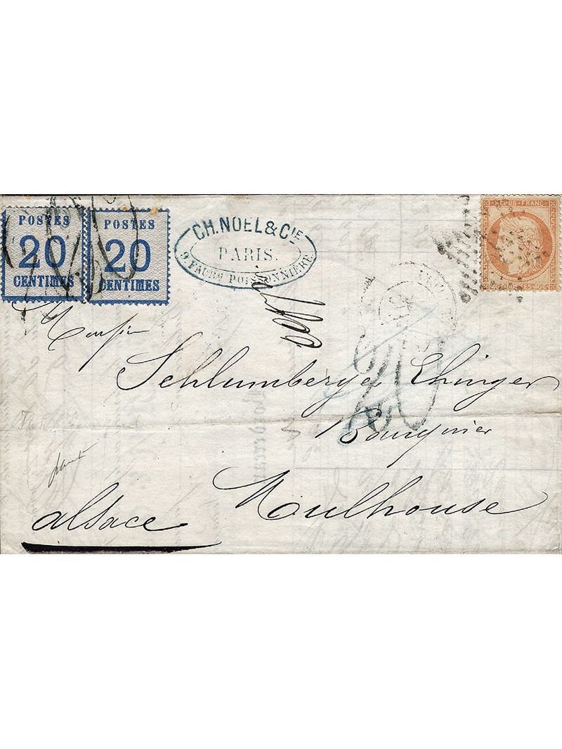 Alsace Lorraine 20 centimes bleu, deux unités avec léger défaut, oblitérés par la taxe 20 au tampon, et 40 centimes orange du siège oblitéré par l'étoile sur une lettre avec correspondance, envoyée en double port du double affranchissement à destination de Mulhouse en zone occupée. Au verso, le cad allemand bleu d'arrivée. Superbe et très rare composition. Signée Baudot.