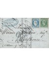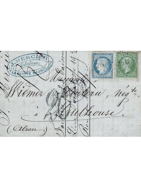Sèige 20 centimes bleu et 5 centimes vert sur bleuté, oblitérés losange des ambulants AVP2 sur une lettre avec correspondance de la Petite Raon à destination de Mulhouse. Au recto, le cachet à date des ambulants d'Avricourt à Paris et la taxe allemande à 20 centimes au tampon. Très belle et très rare composition.