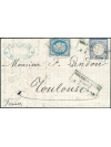 20 c bleu siège oblitéré par le losange gros chiffres 420 en double affranchissement du 31 janvier 72 avec le timbre allemand bleu 2 Groschen, oblitéré par le cachet allemand rectangulaire de Mulhausen Bahnhof ( gare) sur une lettre à destination de Toulouse.