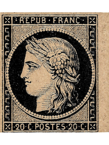 20 centimes noir, neuf avec gomme sans charnière avec quatre belles marges dont le bord de feuille. Superbe nuance chamois très foncé. Cote : 2800€. Superbe. Signé avec certificat.