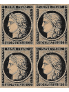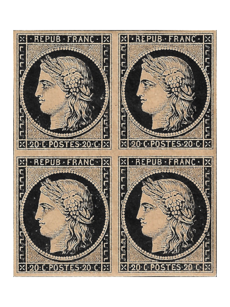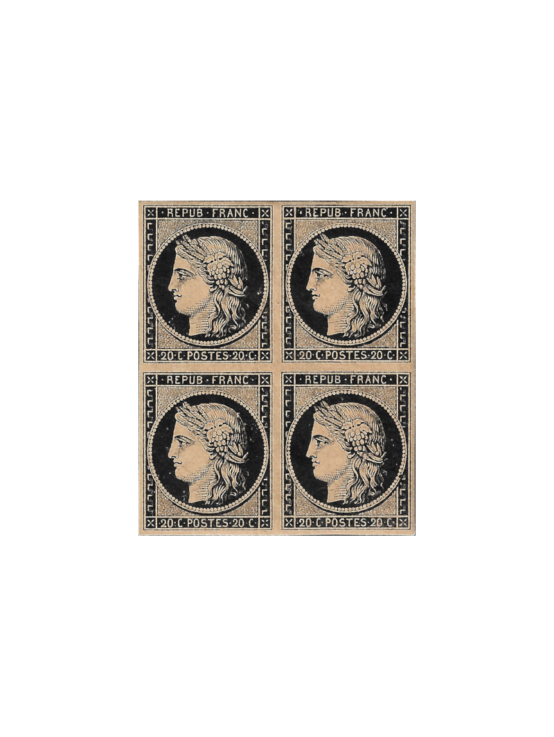 20 centimes noir, bloc de 4 neuf avec gomme sans charnière. Bloc avec une très rare et belle nuance chamois très foncé et quatre très belles marges. Cote : 11200€. Exceptionnel. Signé avec certificat.