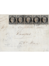 20 centimes noir en bande de 5, les deux exemplaires de gauche ont une marge plus courte, oblitérés par la plume et par le cachet à date d'Alençon le 11 janvier 1849 sur une lettre avec correspondance à destination de Langues. Exceptionnelle composition de Janvier 49. Signé ROUMET. Certificat.