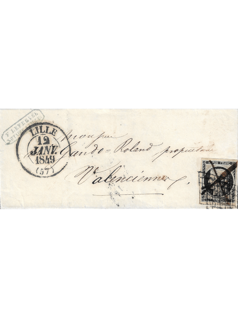 20 centimes noir intense de très belle qualité avec voisin du dessous, oblitéré par la grille, deux frappes et par deux traits de plume sur une lettre avec correspondance à destination de Valenciennes. Au recto, le grand cachet à date type 13 de Lille le 12 janvier 1849. Très belle lettre. Grande rareté. Signée CALVES avec certificat.