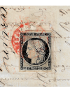 20 centimes noir, avec un léger défaut de marge, oblitéré par le cachet à date rouge du bureau central de Paris sur fragment de lettre. Très rare. Signé BRUN.