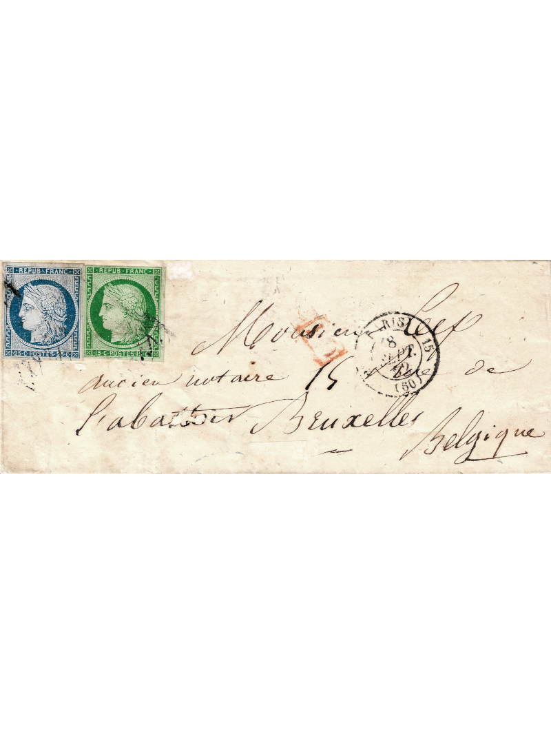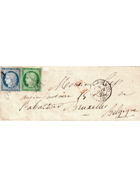 15 centimes vert, très beau et 40 centimes bleu, (légers défauts) à gauche, oblitérés par la grille sans fin sur une lettre sans correspondance à destination de Bruxelles en Belgique. Au verso, le cad d'arrivée. Très rare affranchissement. Cote : 7000€. TB. Certificat.