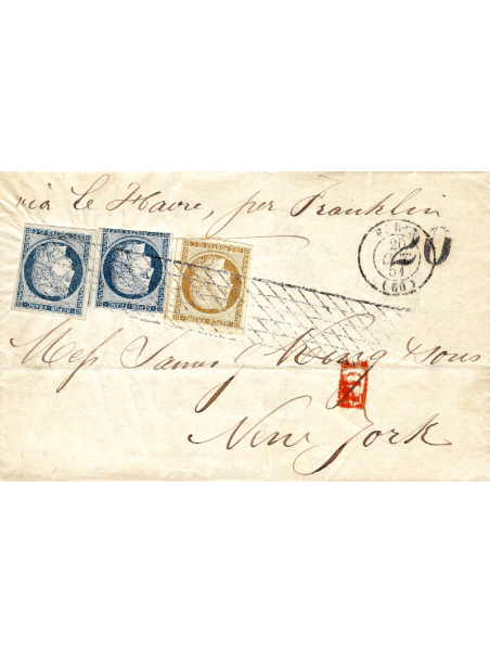 10 centimes bistre avec des marges immenses dont un voisin et 25 centimes bleu, deux unités dont un une marge touchée, sur une lettre avec correspondance de Paris à destination de New York par le Havre. Au recto, le cachet de Paris le 20 octobre 51 et la taxe américaine à 20 cents. Très belle et rare composition. Certificat.
