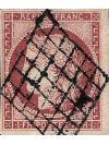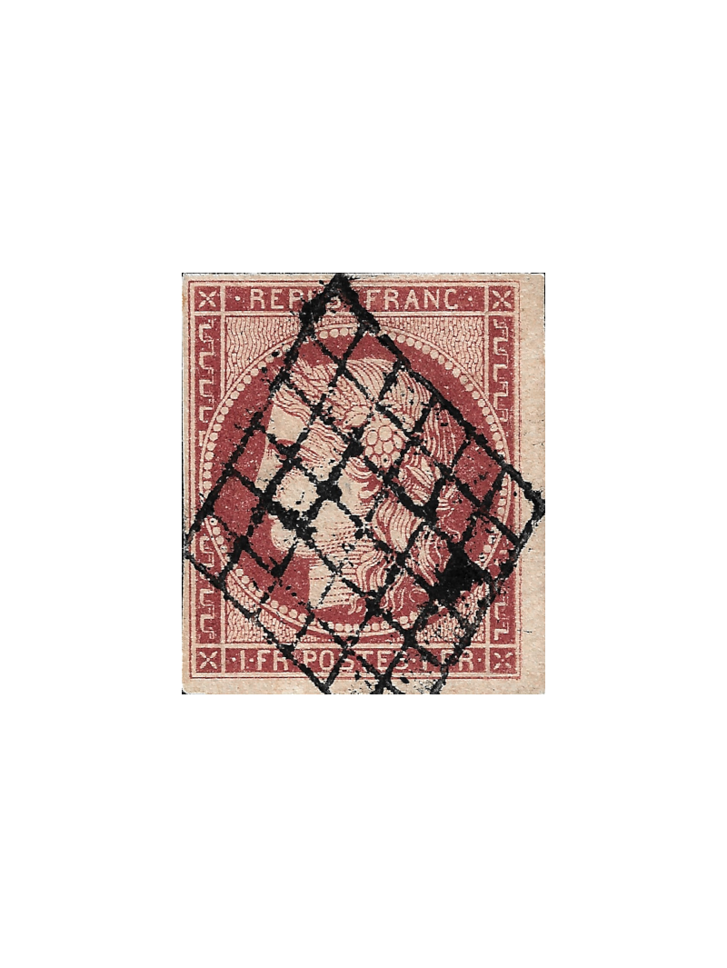 1 franc exceptionnel nuance rouge brun, timbre de très belle qualité, avec deux très grandes marges, oblitéré par la grille. Superbe signé.
