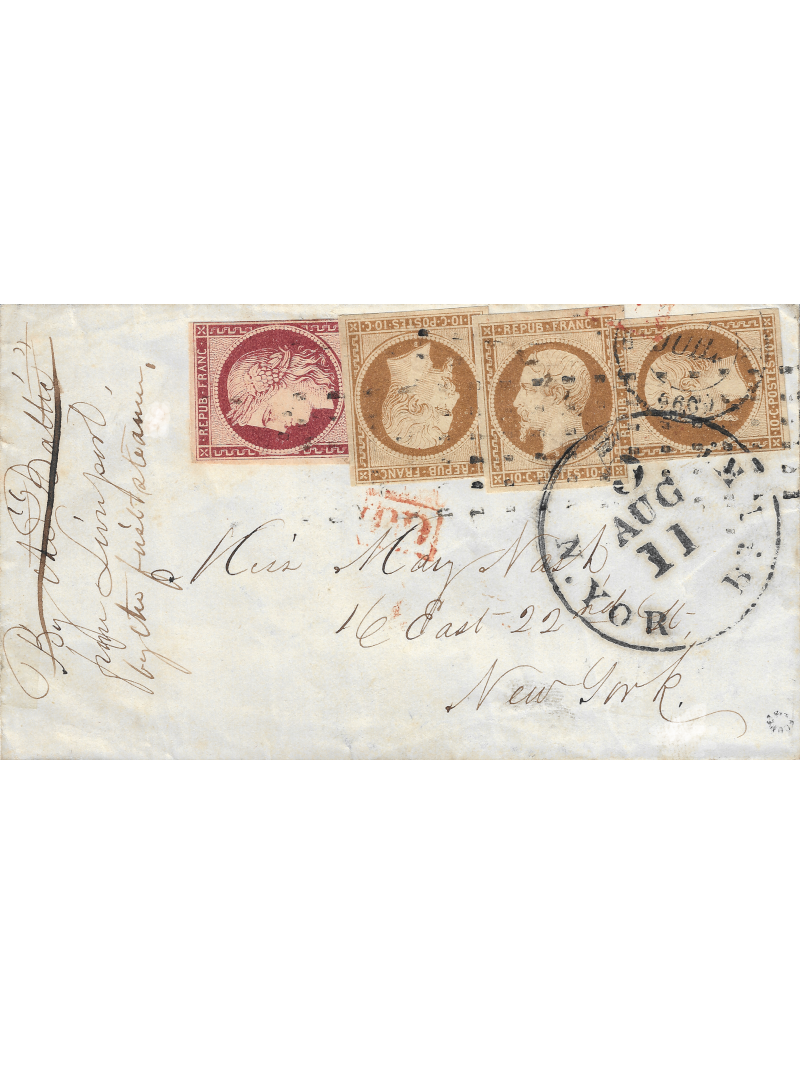 1 franc carmin, marge de droite au filet et 10 centimes bistre, trois unités de superbe nuance bistre brun, oblitérés rouleau de points, sur une lettre sans correspondance (enveloppe) à destination de New York le 11 août 52. Superbe composition, signée ROUMET avec certificat.