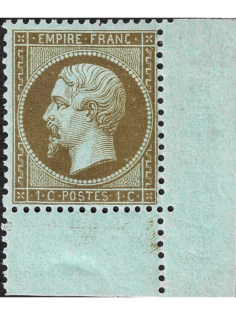 Empire dentelé 1 centime, superbe nuance mordorée, exceptionnel coin de feuille, neuf avec gomme sans charnière. Superbe. Signé ROUMET.