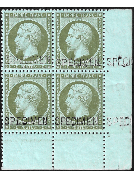 Empire dentelé 1 centime olive bloc de 4 neuf avec gomme, surcharge SPECIMEN. Très bon centrage et très belle qualité avec coin de feuille. Signée ROUMET avec certificat.