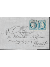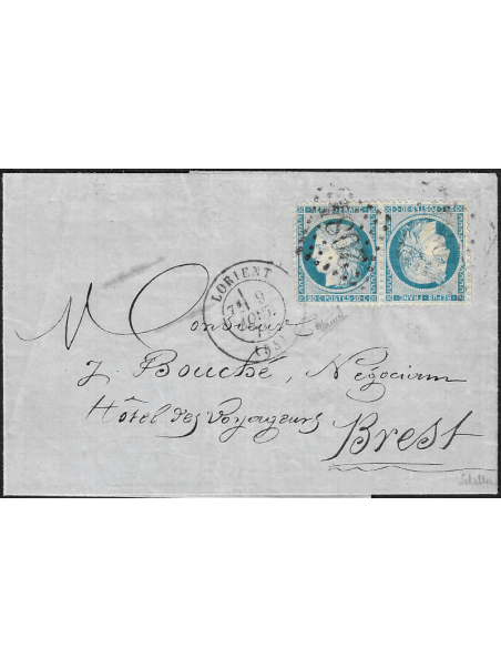 20 centimes bleu sur papier jaune en paire tête-bêche tirage dit de la commune (à noter une dent courte angle bas gauche), oblitéré losange gros chiffres 2084 sur une lettre avec correspondance à destination de Brest. Au recto, le cachet de type 17 de Lorient le 9 août 72. Cote YVERT et TELLIER : 8000 €. Lettre de superbe qualité. Signée JAMET et SCHELLER avec certificat.