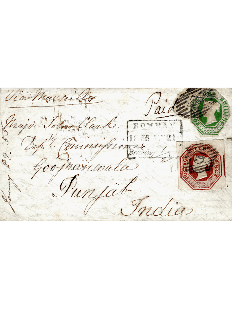 Ten pence brun rouge, superbe et one shilling vert 2nd choix, oblitérés cachet d'un bureau du district de Londres sur lettre avec correspondance pour Punjab en Inde, voie de Marseille. Au recto, le cad de Bombay. Au verso, la cursive Upper Berkley ST. Très rare, cote STANLEY GINBBONS, minimum : 4500 €. Signée CALVES.
