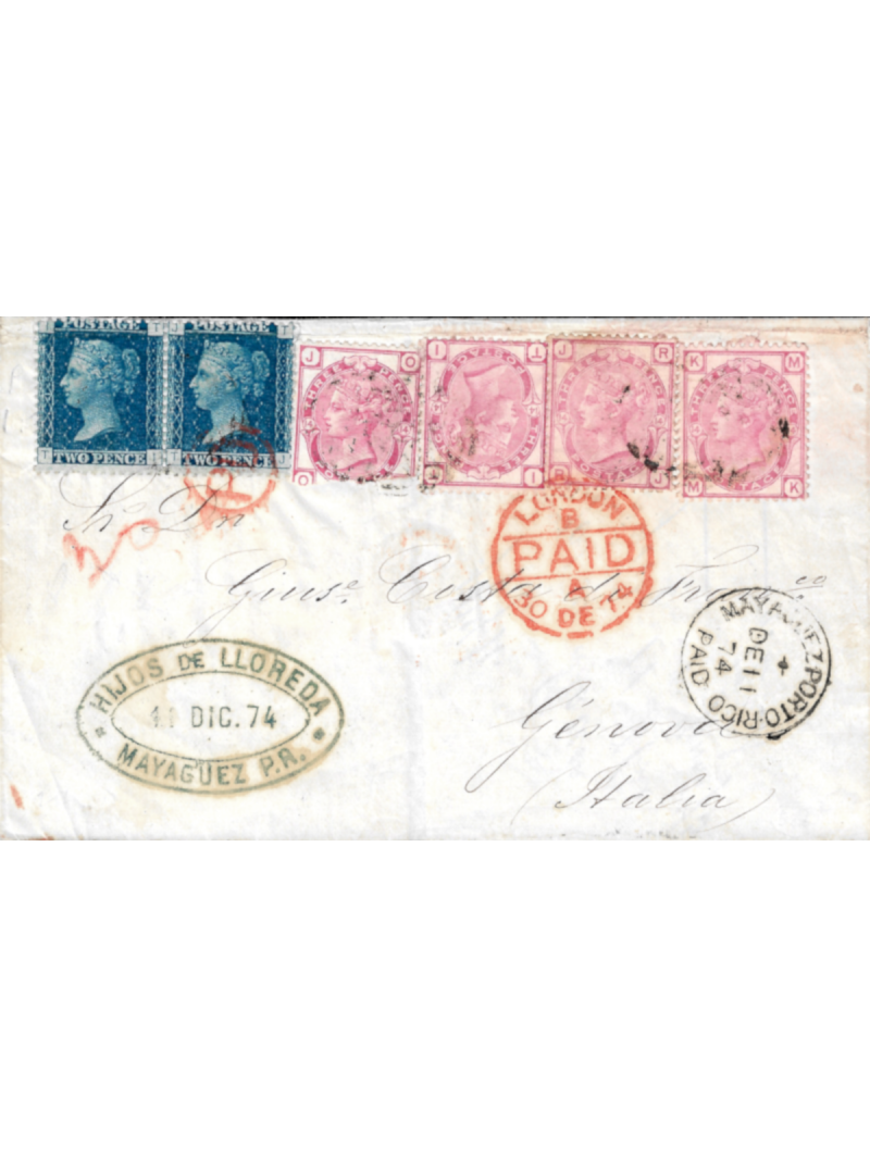 Timbre anglais, Two pences blue dentelé, paire oblitérée PD en rouge et three pence rose quatre unités dont un ex. défaut d'origine, oblitérés cachet ovale de Mayaguez le 11 décembre 74. Au recto, le cachet à date de Puerto Rico. Superbe utilisation du timbre anglais à Puerto Rico.