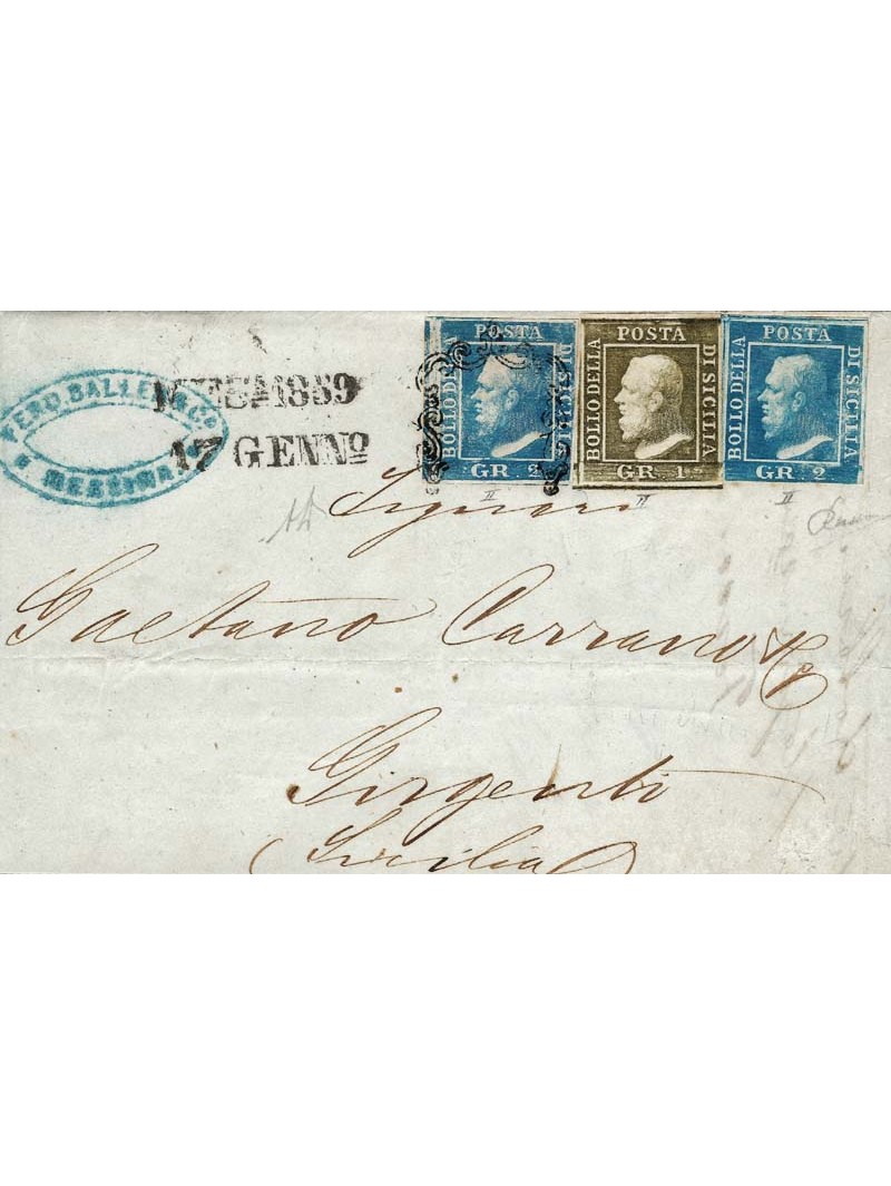 2 grana, bleu cobalt, les 2 exemplaires de la planche II, 1 grana brun olive, planche II (19a, 20a), parfaits sur lettre de Messine datée du 17/01/1859 pour Girgenti, un seul timbre oblitéré. Superbe et très rare affranchissement. Signé RUSSO et DIENA certificat A. DIENA.