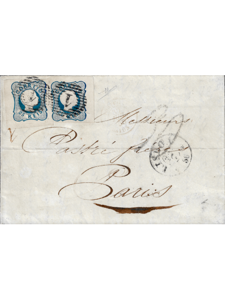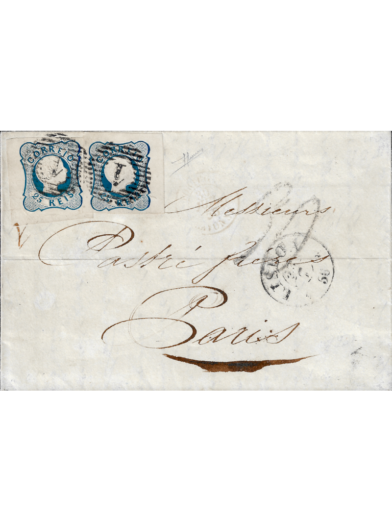 25 reis bleu, variété lignes simples, (non doublées) deux unités avec des marges énormes sur une lettre de Lisbonne à destination de Paris. La lettre a été affranchie au double port du tarif jusqu'à la frontière et à l'arrivée, elle a été taxé à 30 centimes. Au recto, le cachet à date de Lisbonne et le cachet rouge français d'entrée (Portugal Bayonne le 30 juin 1856). Très rare composition et superbe qualité. Signée. Certificat.