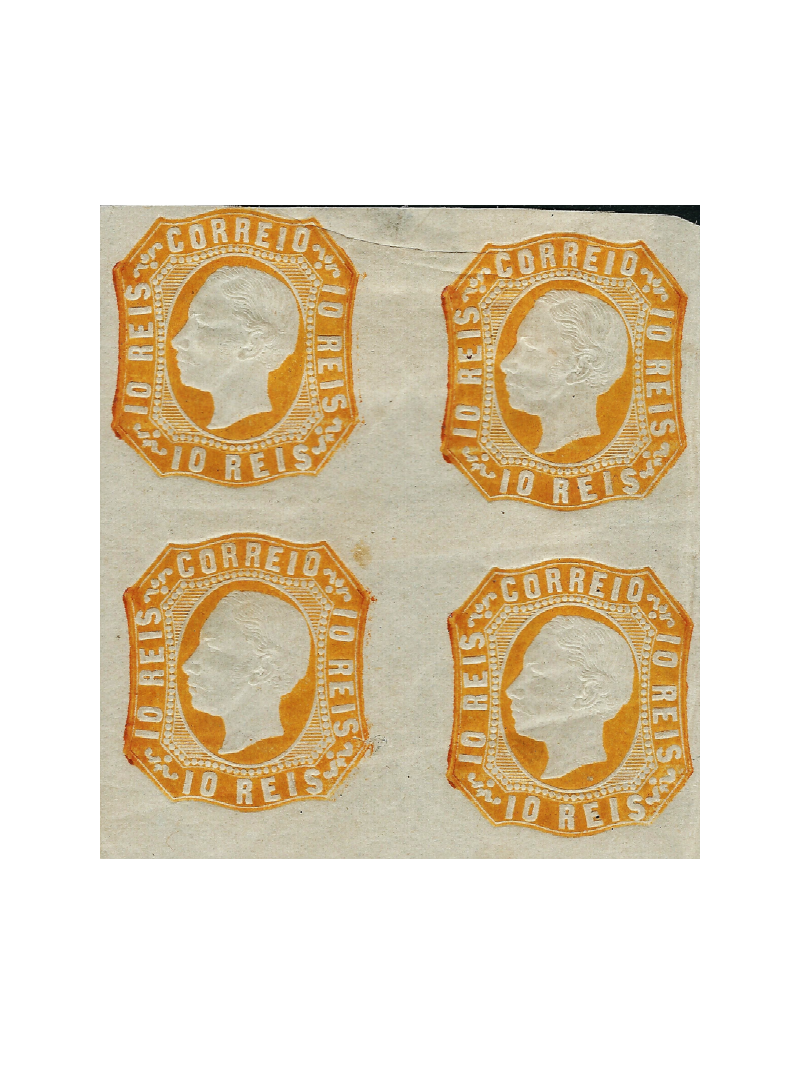 10 reis jaune, neuf avec gomme en bloc de 4, présence d'une charnière en partie haute du bloc. Très belle qualité. Plusieurs signatures. Vendu par la maison SPINK en 2014. TB. RR.