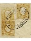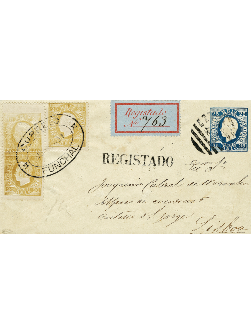 Enveloppe "entiers postaux" préaffranchie 25 reis bleu oblitéré cachet 45, plus utilisé depuis 1870. Affranchissement supplémentaire à 60 reis, bloc de 3 du 20 reis bistre du continent, avec une exceptionnelle et rarissime variété. Le timbre supérieur gauche a une impression fortement décalée en plus d'une double impression sur le timbre inférieur, ce qui se traduit par une partie de triple impression sur ce timbre en plus des deux oblitérations différentes de Funchal. Le bloc de 3 est oblitéré par le cachet ovale de Funchal le 28 août 1881. La lettre a été envoyée en recommandée. Au recto, l'étiquette recommandé n°763 et la marque linéaire REGISTADO. Exceptionnelle et unique. Ex Atlantic Pearl société d'Investissements. Signée CALVES. Certificat.