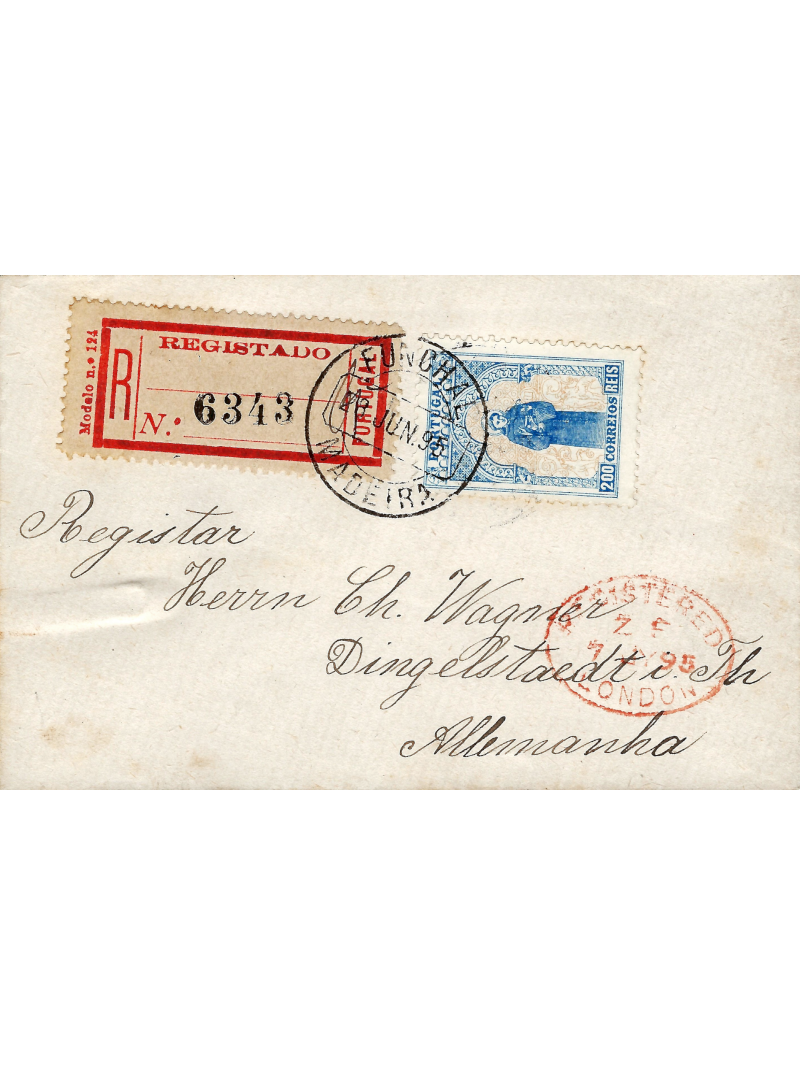 Saint Antoine 200 reis bleu et bistre, oblitéré par le cachet à date de Funchal Madeira le 28 juin 1895 sur une enveloppe recommandée à destination de l'Allemagne par la voie d'Angleterre. Au verso, le CAD de Londres. Ensemble superbe et rarissime. Superbe. Certificat.